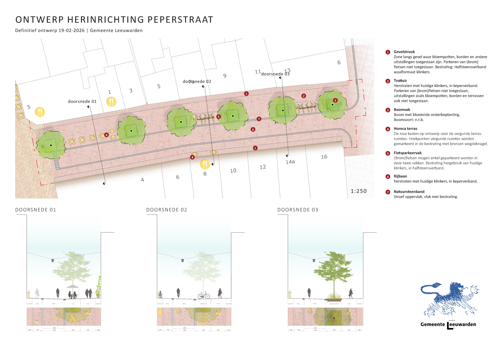 De Peperstraat krijgt een nieuwe inrichting. Daarbij zorgen we voor een goede verdeling tussen voetgangers, fietsers, autoverkeer, groen en terrassen.